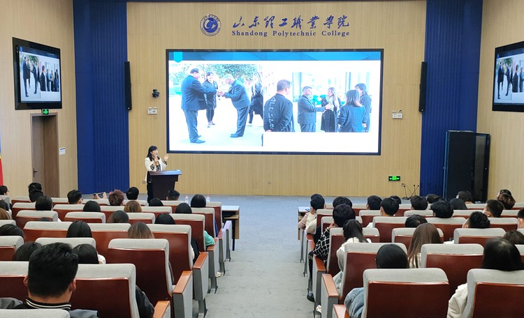 At the special invitation of the Business School of Shandong Polytechnic Vocational College, on the afternoon of October 14, Li Zhenbo, President of Jining Cross-border E-Commerce Association, Executive Deputy General Manager of Shandong Weixin, General Manager of Information Technology, and Secretary-General of Jining Cross-Border E-Commerce Association, Zhang Wen, general manager of Shandong Weixin's cross-border e-commerce business, Huang Shihong, Shandong Weixin's administrative deputy general manager, and Feng Yuyang, head of the group's human resources department, went to Shandong Polytechnic Vocational College and worked for more than 100 business schools in e-commerce and cross-border e-commerce. Students gave lectures on cross-border e-commerce development. It was warmly welcomed by many leaders and teachers and students such as Nie Miao, Dean of the School of Business of Shandong Polytechnic Vocational College, Zhang Yuanhua, Secretary of the Party Branch, Fu Kai, Chief of Student Section, Duan Chunyan, Chief of Teaching Section.
